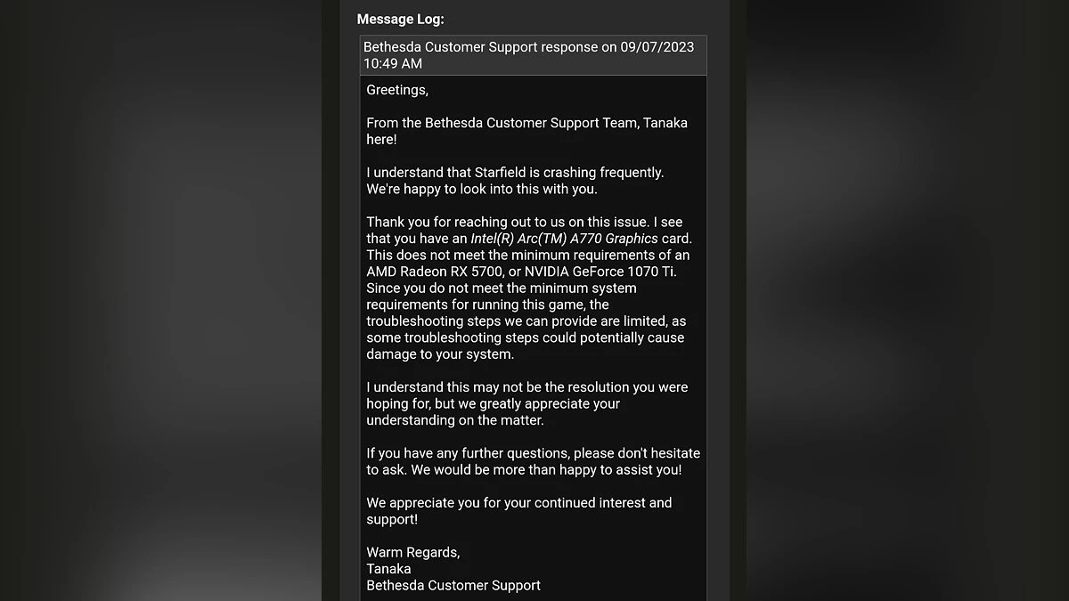 Bethesda оказала разочарование для одного из игроков Starfield, сообщив ему о том, что его видеокарта Intel не соответствует минимальным требованиям игры. Конкретно, служба поддержки Bethesda уведомила геймера о том, что флагманская видеокарта Intel Arc A770 не сможет обеспечить полноценную работоспособность игры. Настройки графики приходится установить на минимальные, но даже при этом игра работает с низкой частотой кадров в размере 30 FPS.