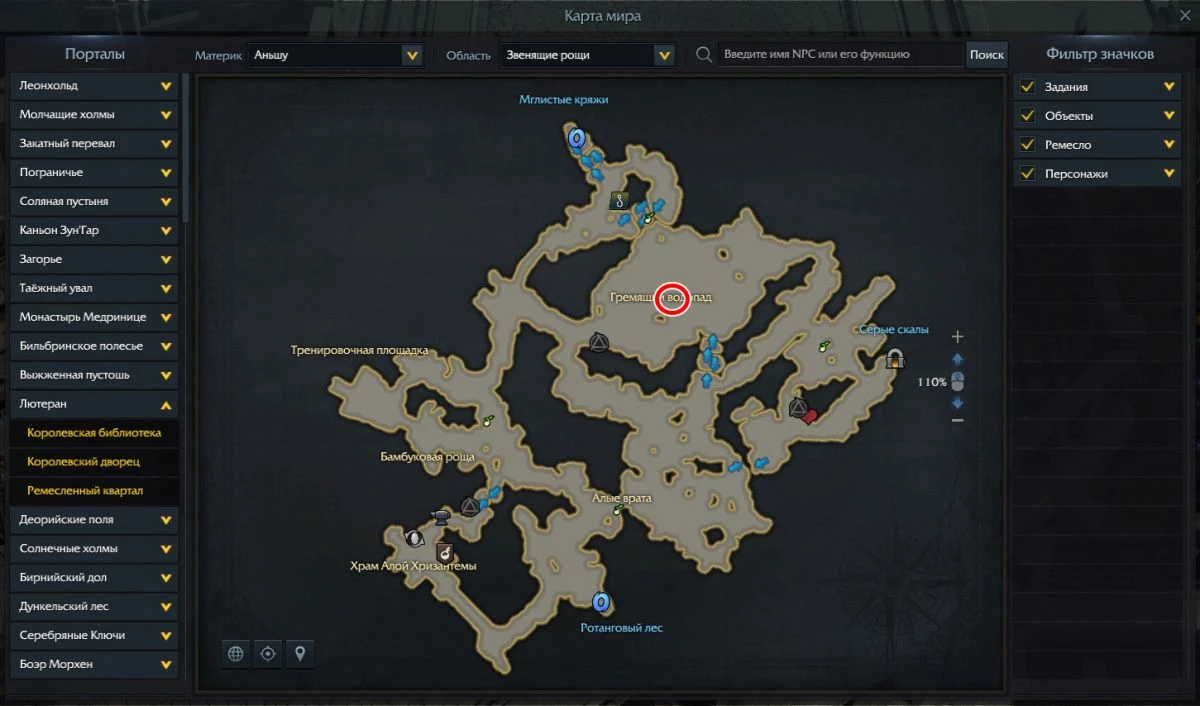 Тень Чо-ю находится на Аньшу, в Звенящих рощах. Чтобы найти мирового босса для атласа, требуется двигаться чуть выше портала, к самому центру области Гремящий водопад.