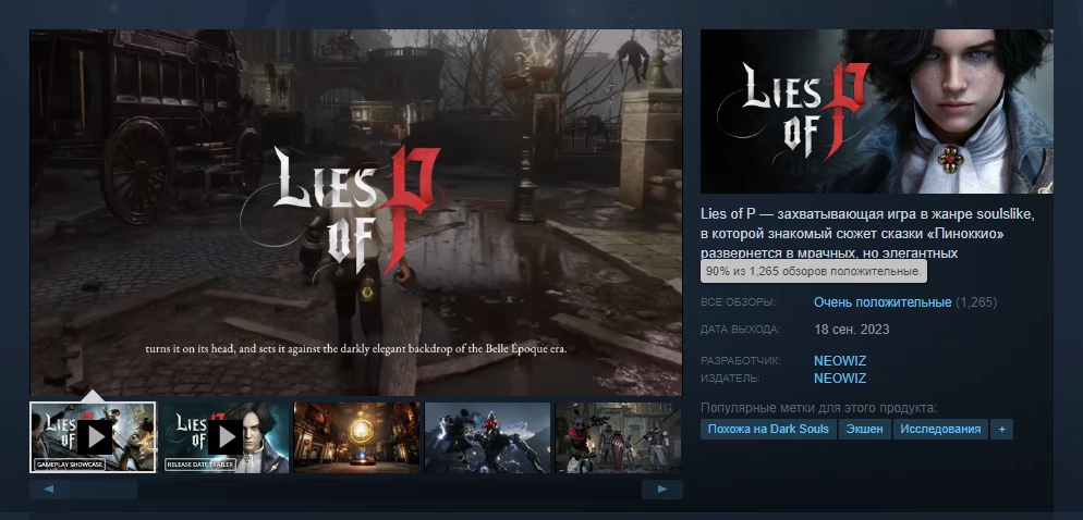 Игру Lies of P можно приобрести в Steam за 3999 рублей. Она также доступна на PS4, PS5, Xbox One и Xbox Series X/S.