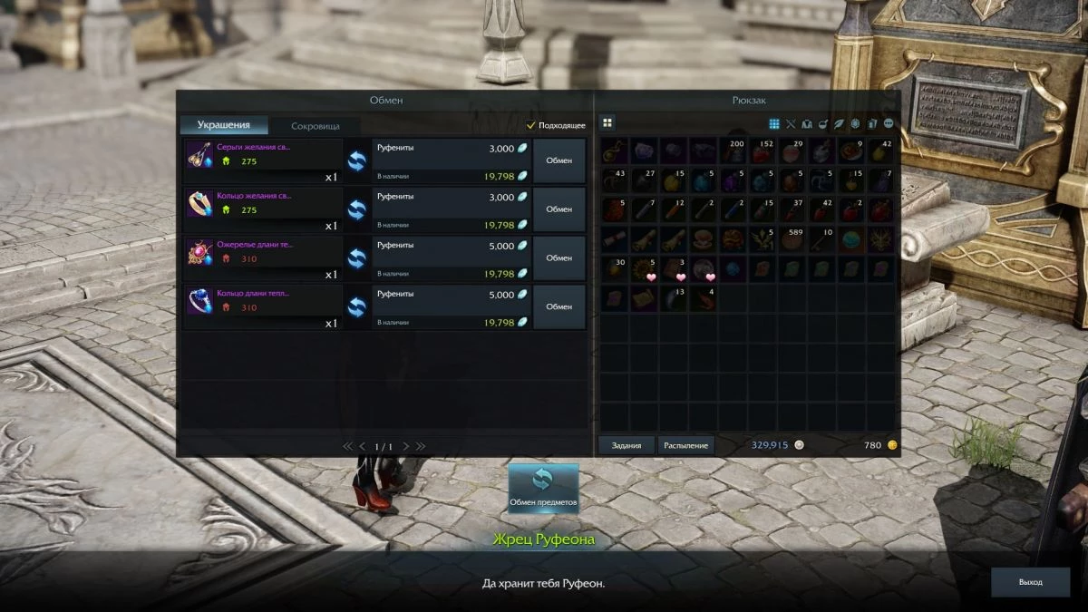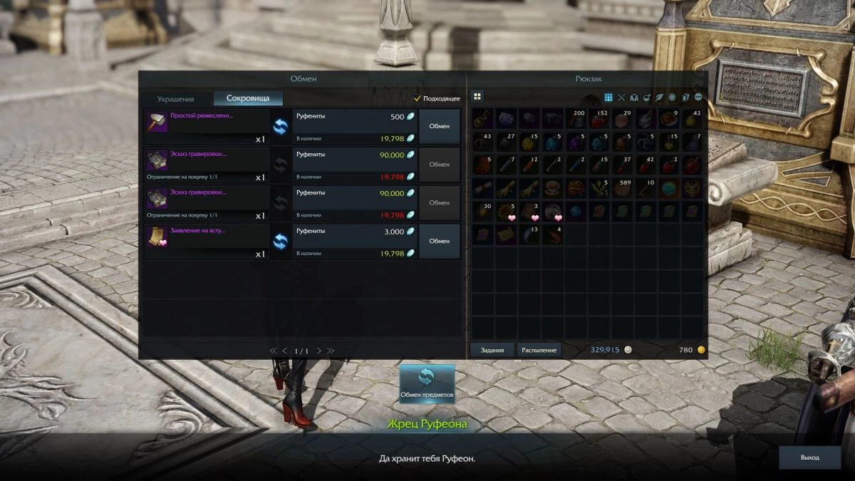 По достижении максимального левла идём в ближайший крупный город, вроде Лютерана, находим жреца руфеона (иконка серого кристалла в кругу) и смотрим предметы обмена на руфениты. Можно приобрести бижутерию (скрин ниже, первая вкладка), либо сокровища (вторая вкладка у вендора).