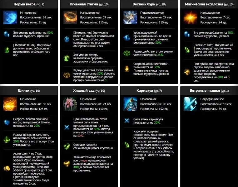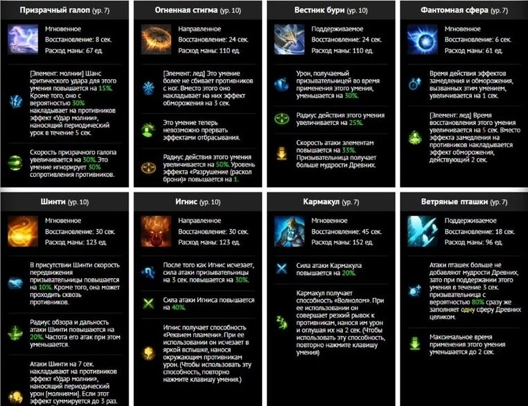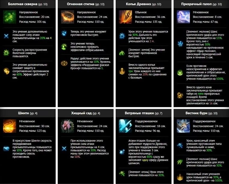 Здесь Призывательница – это тяжёлая артиллерия. Избегаем ближнего боя, накрываем по области в сторону врага и держим массово в стагерах. В этом режиме ещё более важны умения древних.