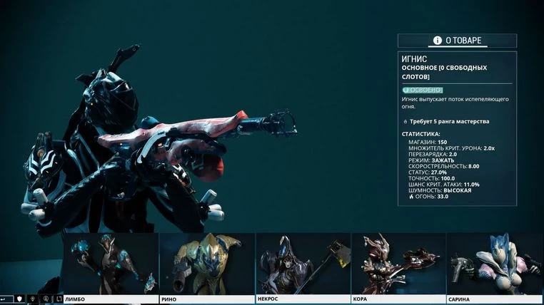 Такая экипировка сможет значительно облегчить ваше становление на пути Тэнно. Оружие, которым я рекомендую как можно скорее обзавестись любому новичку, является Игнис или Игнис Призрак. А в число рекомендуемых мною для скорейшего приобретения варфреймов вошли Сарина, Кора, Некрос, Рино, и было бы неплохо освоить Лимбо. Многие, наверняка, не согласятся с моими рекомендациями, но это лишь моё лично мнение. И оно заключается в том, что рекомендуемая мною экипировка на первых порах способна перекрыть весь спектр поставленных перед новичками задач.