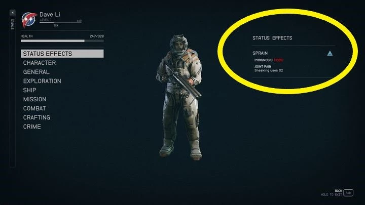 В правом верхнем углу меню статуса вы найдете информацию о полученной вами травме. Также будет указан тип травмы и степень серьезности негативного эффекта.