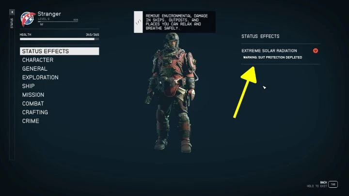В игре вам будет предупреждение о том, что ваша радиационная защита истощена (или о других формах заражения). Вы также можете узнать об отрицательном статусе в меню персонажа в разделе "Статусные эффекты". Получение такого эффекта может привести к некоторым последствиям, таким как сокращение максимальной планки здоровья (уменьшение отметки в оранжевом цвете на шкале).