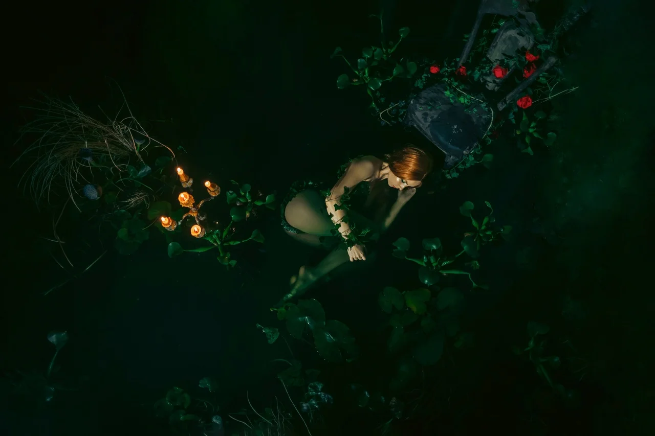 Она облачилась в костюм, покрытый зелеными листьями. Этот образ является классикой жанра. Кроме того, Анастасия продемонстрировала своего героя в воде, а хитрые свечи создали особую атмосферу.