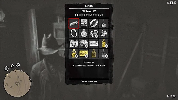 По завершению задания, вы сможете найти Сэди в лагере и подарить ей гармошку – для этого зажмите левый триггер и нажмите кнопку пожертвования. Сэди отблагодарит вас небольшим подарком, который появится на сундуке рядом с кроватью Артура через некоторое время.