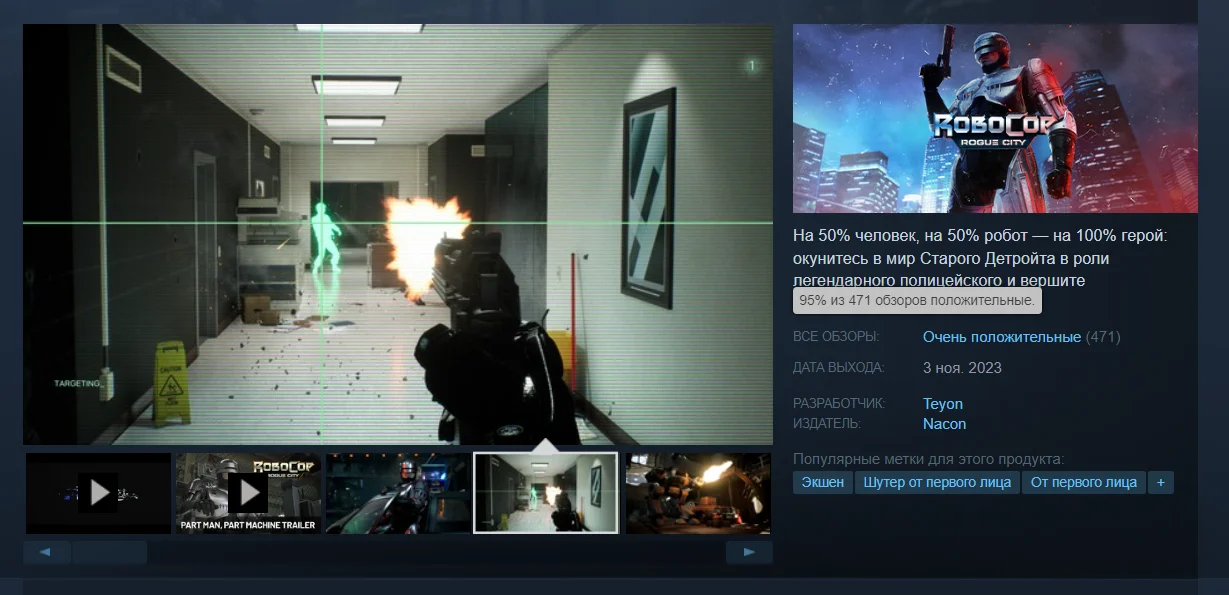 Приключенческий шутер RoboCop: Rogue City был тепло встречен игроками на платформе Steam. В настоящий момент игра набрала около 470 пользовательских обзоров, из которых 95% являются положительными.