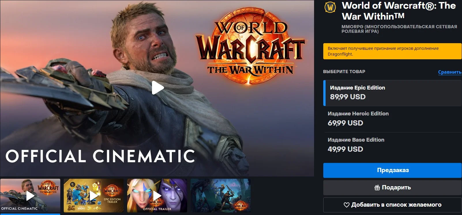 Жаждущие попасть в самую остроту событий и первыми испытать все прелести World of Warcraft: The War Within должны распотрошить финансовую "подушку" и отдать 90 долларов за обширное издание. Взамен они получат возможность на три дня опередить всех, кто впоследствии присоединится к игровому миру.