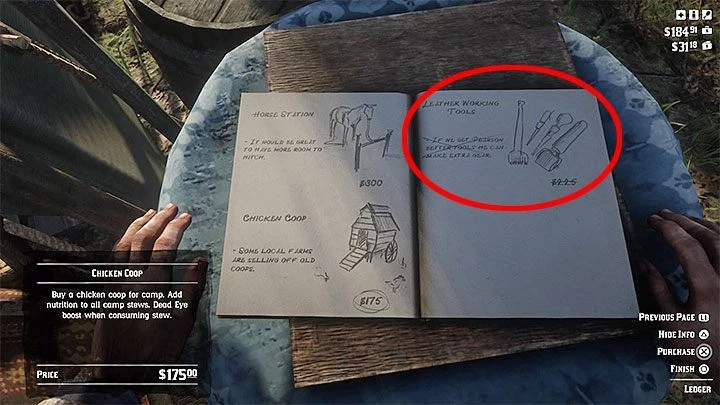 К счастью, добыть инструменты для обработки кожи достаточно просто. Один из проектов по расширению лагеря голландской банды открывает данную возможность. Вам потребуется достать бухгалтерскую книгу в лагере и начать изучение доступных проектов. Инструменты будут находиться на последней странице. Их стоимость составит 225 долларов. Приобретая их, вы получаете постоянное улучшение, и в дальнейшем вам не придется заботиться о пополнении запасов в игре.