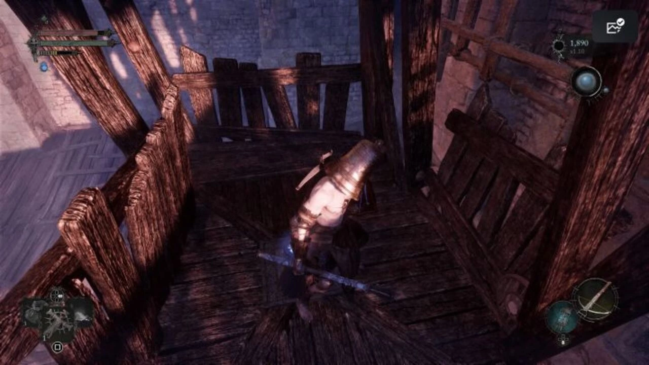 - Далее по винтовой лестнице можно продолжить путь к самому верхнему этажу Скайреста. На этой части здания вас ожидает не только заключенные и таинственные останки (доступны в Умбрале), но и секретный проход, показанный на скриншоте.