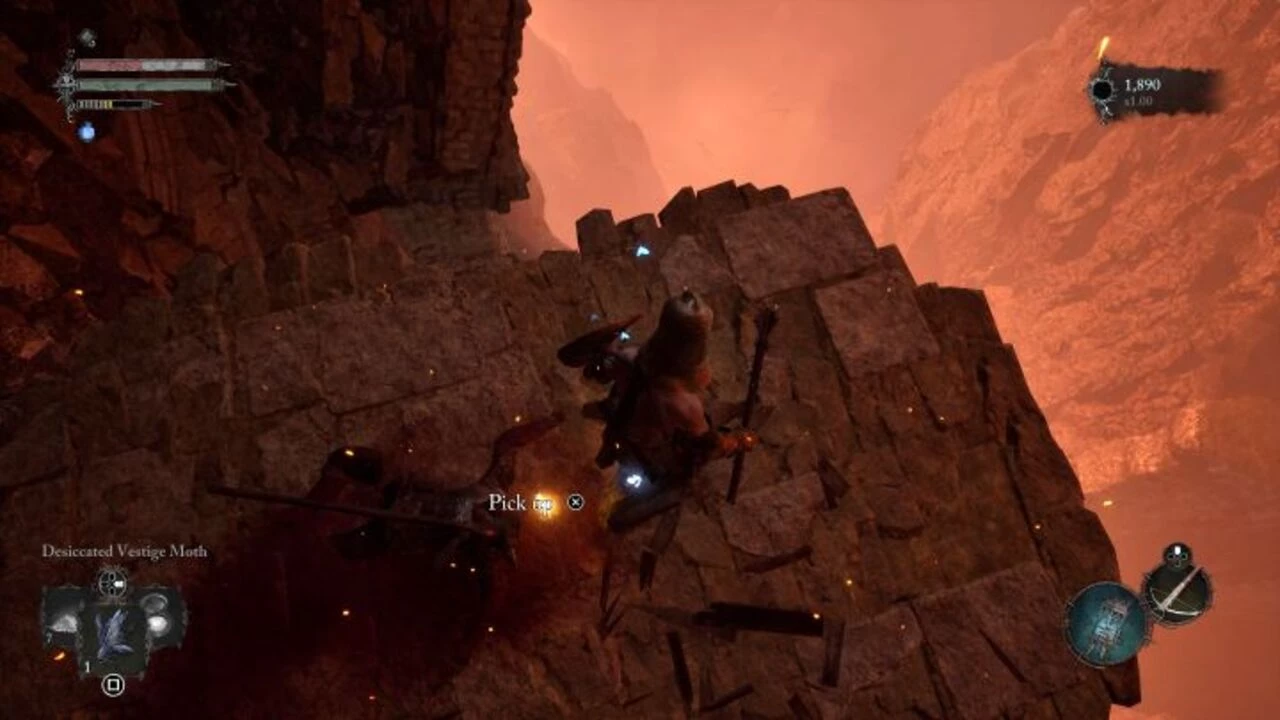 - Переключитесь в Умбралу и перейдите через костяной мост. Это приведет вас к алтарю с шипами (как показано на скриншоте). Здесь использование лампы позволит вам получить ключ от моста Скайрест.