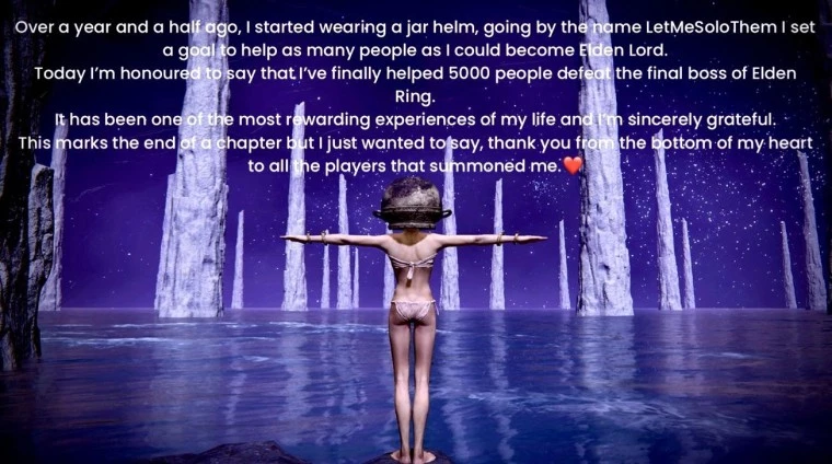 Однако этот ветеран больше не собирается продолжать помогать игрокам в Elden Ring. По его мнению, достижение отметки в 5000 побед является вполне впечатляющей, и настало время начать "новую главу" в его жизни.