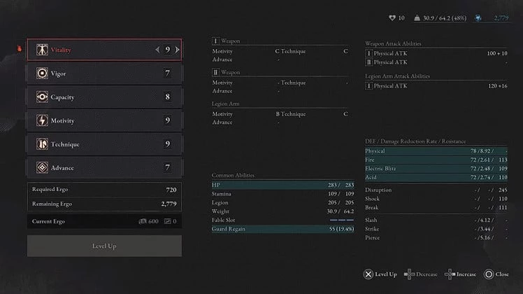 - Capacity: Capacity определяет общий вес, который может нести персонаж, а также влияет на эффективность способностей и характеристик руки Легиона. Превышение предельного веса приведет к замедлению передвижения и уязвимости перед врагами.