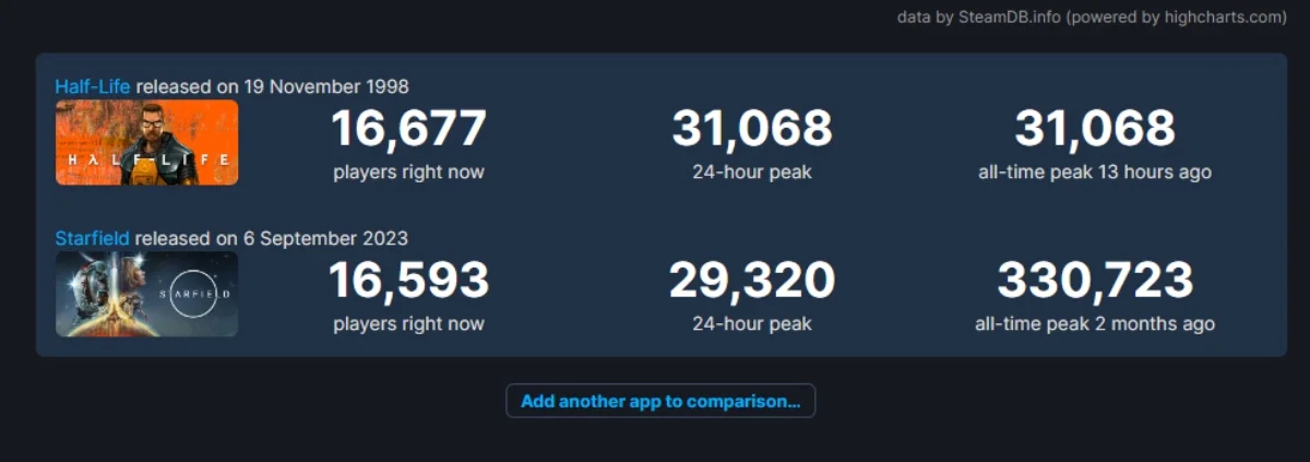 Это относится как к показателю пикового онлайна за сутки, так и к текущему количеству одновременных игроков на платформе Steam. По последнему показателю Half-Life вышла вперед Starfield еще вчера, удерживая лидерство несколько часов.