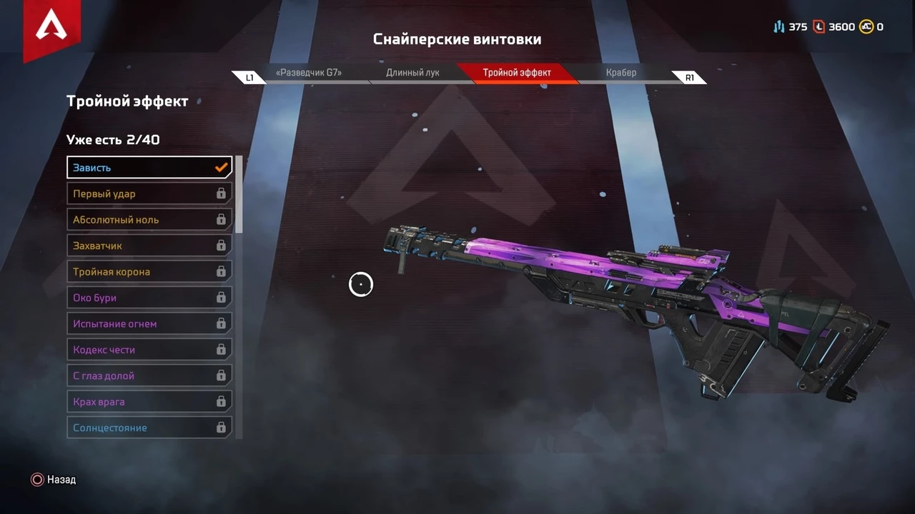 Тройной эффект-Она использует энергетические заряды и имеет магазин на 5 патронов. Тройной эффект наносит 23 урона выстрелом в тело и 46 урона выстрелом в голову. Оно имеет особую способность выпускать три снаряда с каждым выстрелом, что делает его уникальным снайперским оружием. Однако оно имеет высокий разброс и низкую скорость пули, что делает его менее точным на дальних дистанциях. Оно может быть модифицировано для улучшения его характеристик.