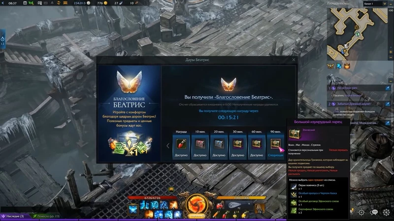 Если вам всё более мене понравилось, то в первую очередь игрок сталкивается с опцией «Купить премиум», который здесь называется «Благословение Беатрис». В принципе, без према играть можно, и вполне себе неплохо. Но скорость одевания, а точнее заточки, будет поменьше. Премиум в игре дорогой, относительно подписки того же World of Warcraft, и стоит 700 рублей. Так как для комфортной игры в первые месяцы он явно не помешает, то добавляем его в список.