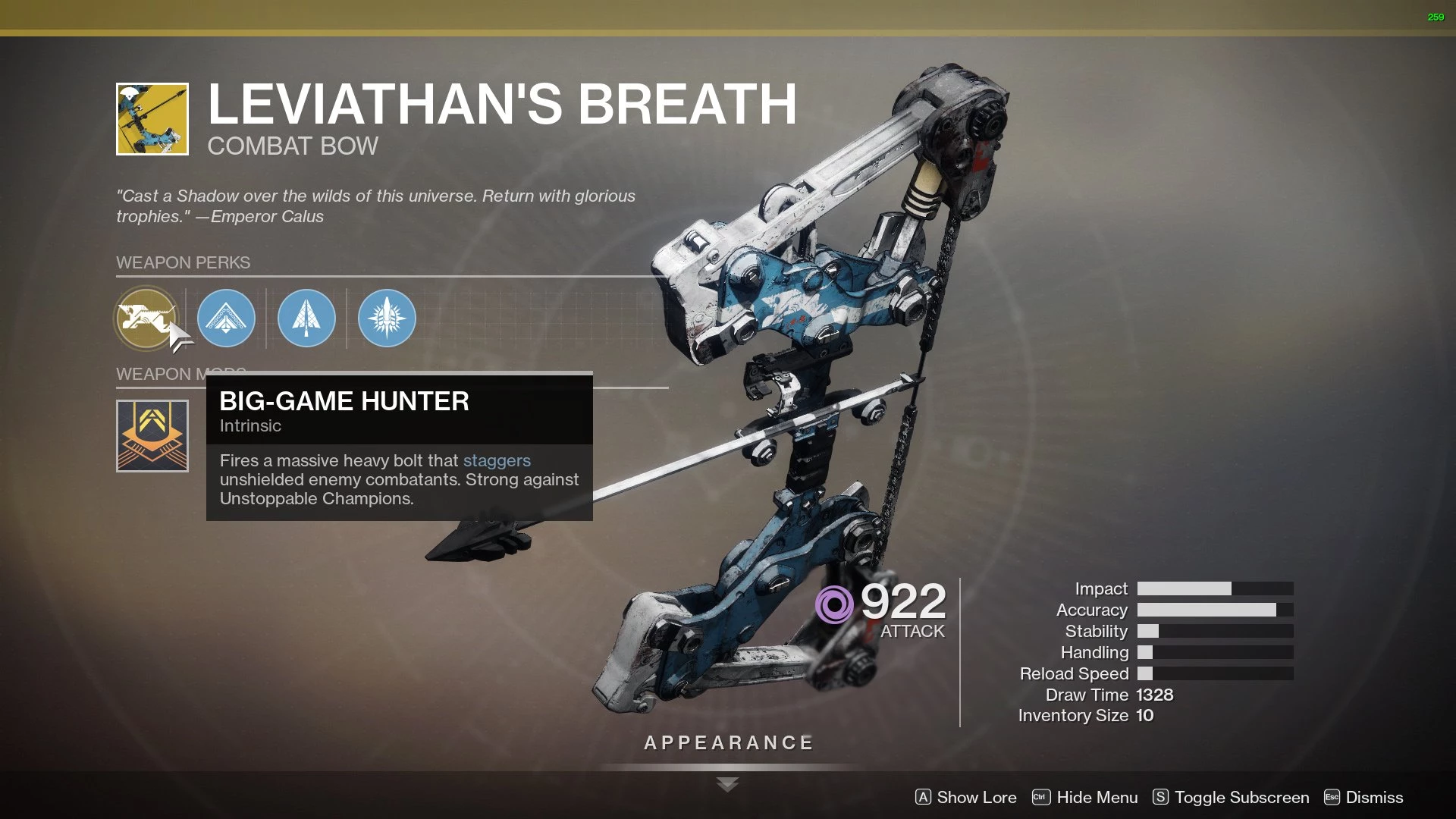 Второй перк, Вздох Левиафана отбрасывает врагов когда лук полностью натянут. Как это работает в Горнило, еще неизвестно, но если оно толкает врагов, оно обязательно будет полезным. Нет ничего более зверского, чем насильственное изменение вашего местоположения вашим противником.