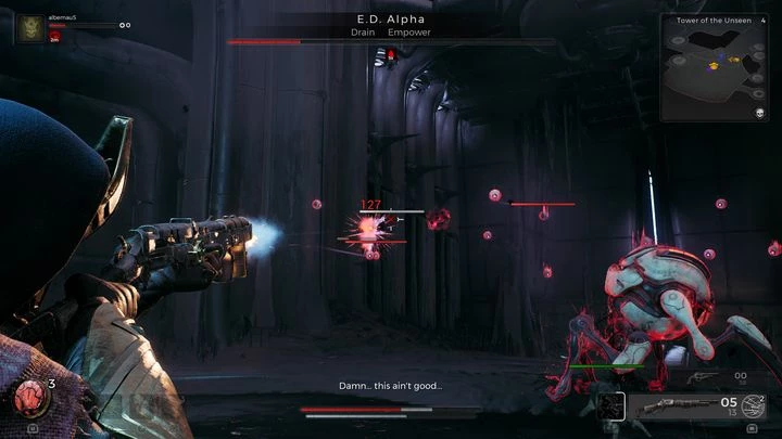 Когда ИД Альфа подходит очень близко, он начинает вращаться. В этом случае стремитесь увеличить расстояние между вами как можно быстрее. Вы можете стрелять в его глаза или ноги — это заставит босса временно покачнуться и прервать атаку.