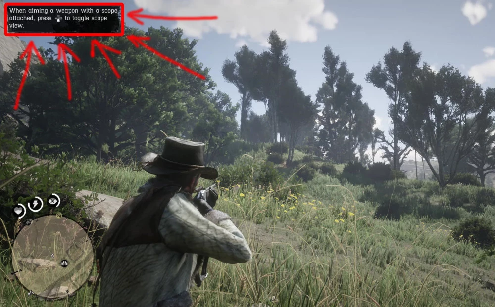 Как только вы получите винтовку с прицелом, игра объяснит, как ее использовать. Вы можете не заметить обучающее сообщение в верхней части экрана. Нужно нажать вниз на крестовине джойстика.