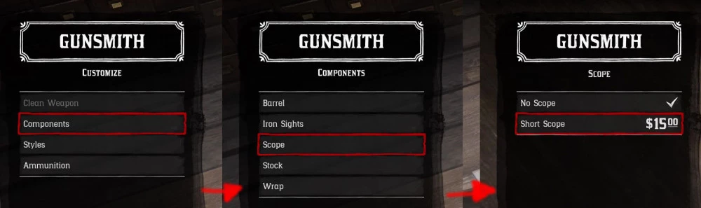 Прицел, как и другие улучшения для оружия, вы можете купить у оружейника. Выберите винтовку, которую хотите улучшить, затем выберите компоненты (вам, возможно, придется сначала ее почистить, в зависимости от состояния). Прокрутите вниз до прицелов и установите тот, который вам подходит.