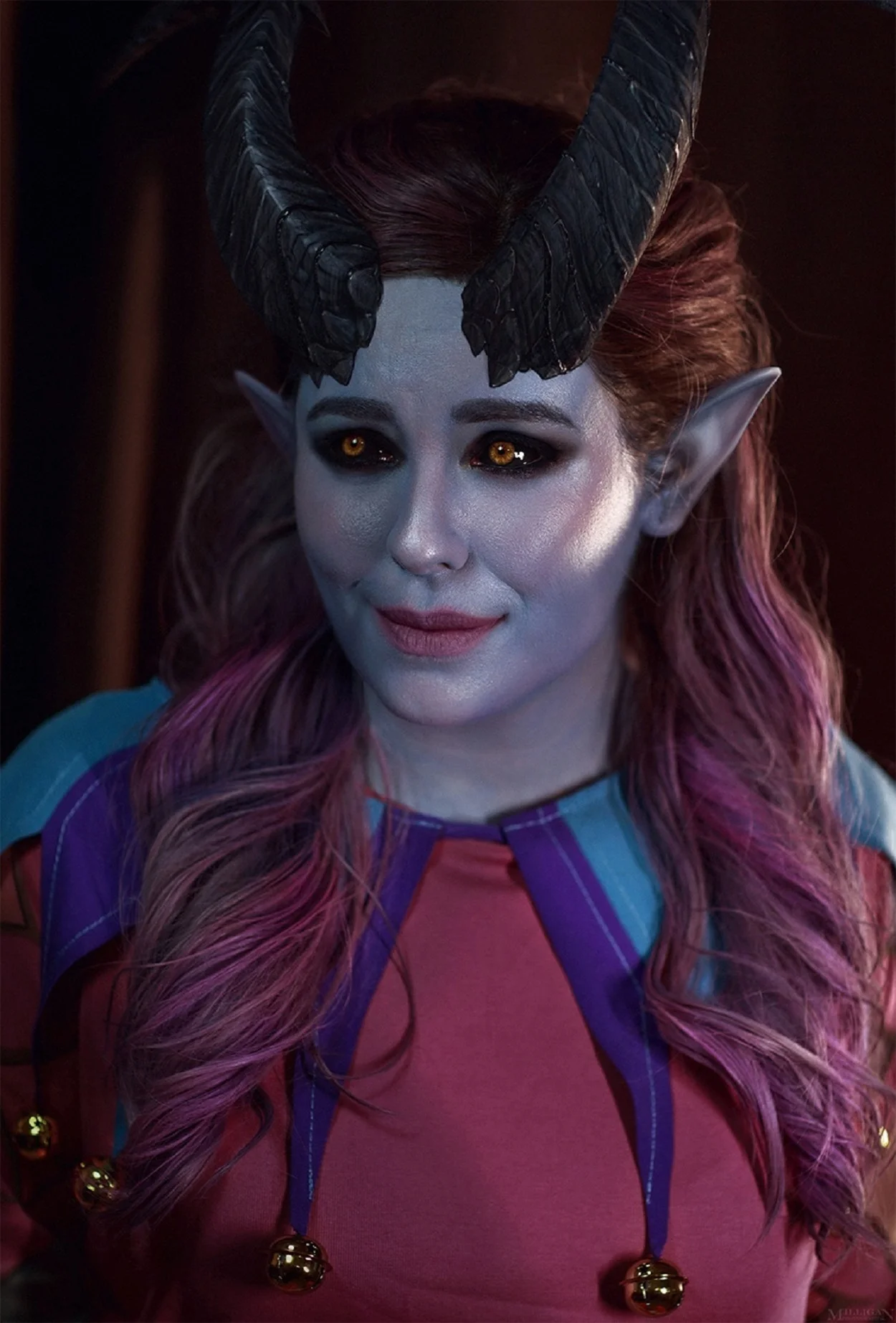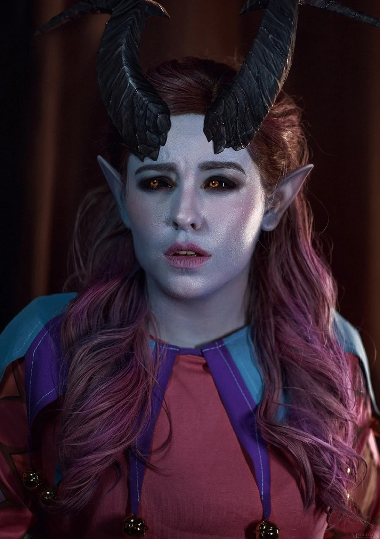 Альфира, бард с прекрасно выглядящей светло-лиловой кожей, обладает длинными темно-сиреневыми волосами и оранжевыми глазами. Помимо портрета, косплеер также продемонстрировала Альфиру, замазанную кровью, что может быть намеком на судьбу персонажа. Девушка заметила, что использованная кровь является искусственной.
