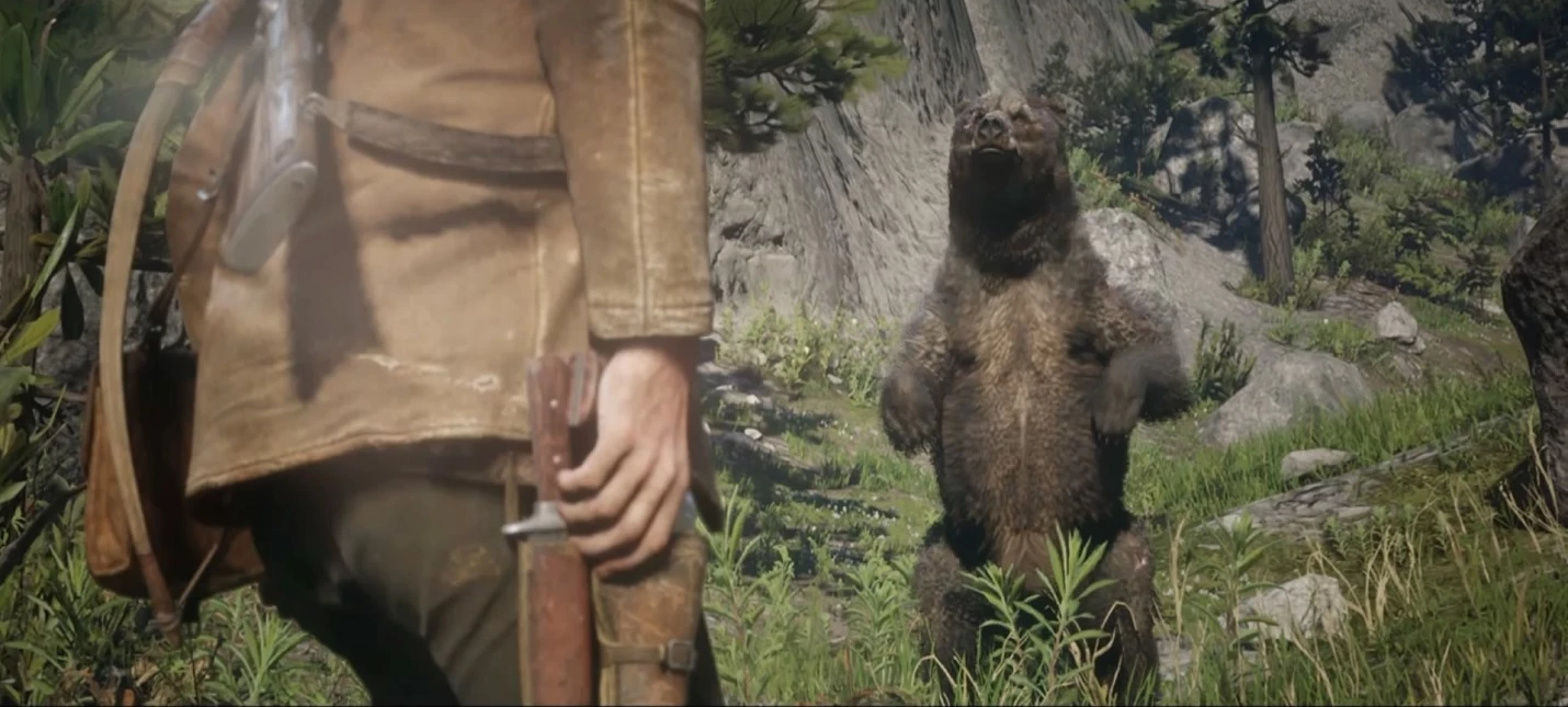 Ваша первая встреча с легендарным зверем состоится во второй главе, когда вы вместе с Хозием отправитесь на охоту на огромного медведя гризли. Убивать его в первый раз совершенно необязательно: вы можете уйти и вернуться сюда позже. Тем не менее, сделаете вы это сразу или спустя несколько часов игры, Артур Морган сможет освежевать зверя и получить уникальный предмет — шкуру легендарного медведя. С ее помощью вы сможете создать мощную экипировку.
