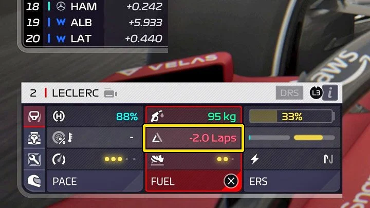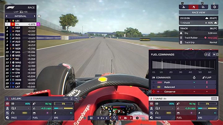Один из самых очевидных способов изменить расход топлива - использовать команды топлива, которые доступны на второй вкладке меню команд водителя. Значение "Сбалансированная" является настройкой по умолчанию и наиболее подходит для проезда большей части гоночной дистанции. Режим "Push" позволяет увеличить скорость за счет более высокого расхода топлива и должен использоваться только в случае необходимости (например, для обгона другого водителя) и наличия избыточного топлива. Однако не рекомендуется держать этот режим включенным слишком долго. Режим "Conserve" позволяет экономить топливо за счет снижения производительности. Используйте его, если расход критичен и есть риск не доехать до финиша или если вы опережаете другого гонщика и можете позволить себе ухудшить свои показатели без угрозы потери позиции.