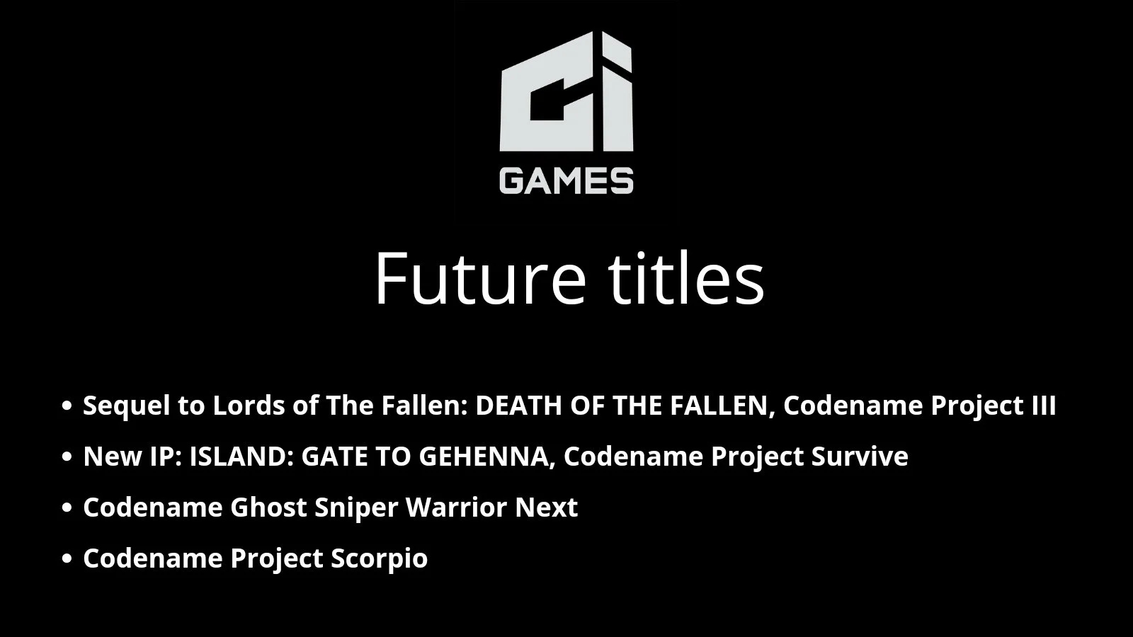 Пользователь Kurakasis провел анализ официальных источников и собрал информацию о проектах студии CI Games. Эти проекты, известные как Project Survive и Project 3, будут созданы с использованием игрового движка Unreal Engine 5. В январе 2024 года польская студия зарегистрировала название Death of The Fallen для проекта Project 3, который является сиквелом ролевой игры Lords of the Fallen. Релиз этой игры запланирован на 2026 год.