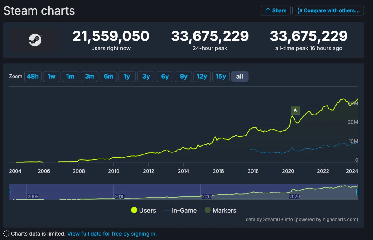 В начале 2024 года Steam установил новый рекорд по количеству одновременных пользователей — более 33,6 млн человек.