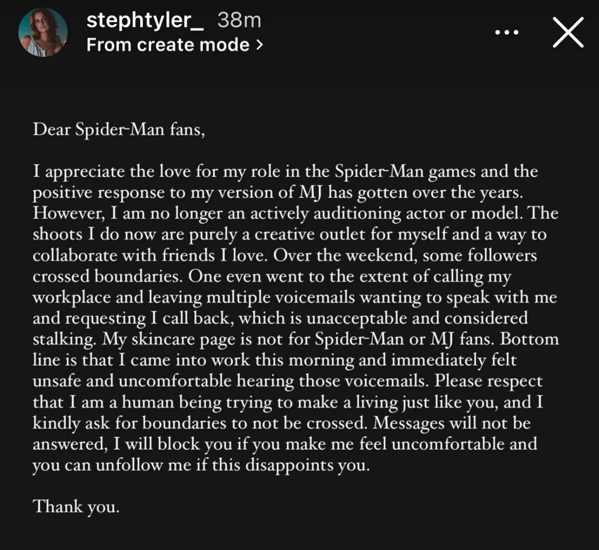 Моя страница в соцсетях, посвящённая уходу за кожей, не предназначена для поклонников „Человека-паука“ или Эм-Джей. В итоге, когда я пришла сегодня утром на работу и услышала эти голосовые сообщения, то почувствовала себя небезопасно. Пожалуйста, проявите уважение к тому, что я тоже человек, который, как и вы, пытается зарабатывать на жизнь. Я убедительно прошу вас не переходить границы дозволенного», — заявила Стефани Тайлер Джонс.