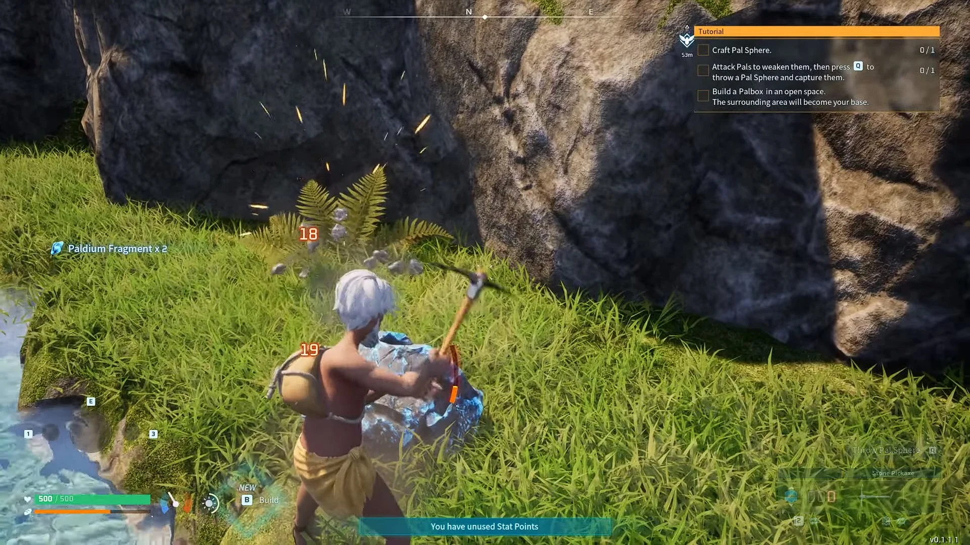 Чтобы начать добычу обычных камней и палдиевых руд, необходимо сначала создать каменную кирку. Это один из начальных инструментов/оружий в Palworld, который можно создать уже в первый час игры. После того, как вы обзаведетесь каменной киркой, отыщите палдиевую руду и приступайте к добыче фрагментов палдиума.