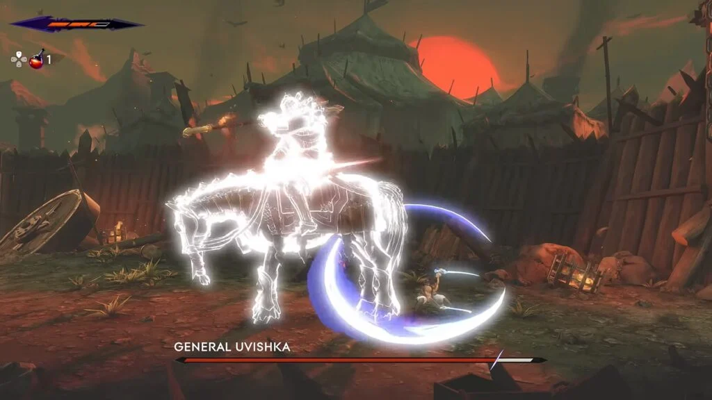 В первой фазе боя участвуют генерал Увишка и его лошадь, и вам нужно сбросить Увишка с лошади. Этот этап проще, чем второй, поскольку все атаки Увишка можно предугадать, нажав R2/RT, чтобы уклониться от атаки и атаковать его сзади. Если вы предпочитаете парировать атаку, то вам нужно точно нажимать L2/LT, чтобы парировать удар, и продвигаться вперед, чтобы нанести ему урон.