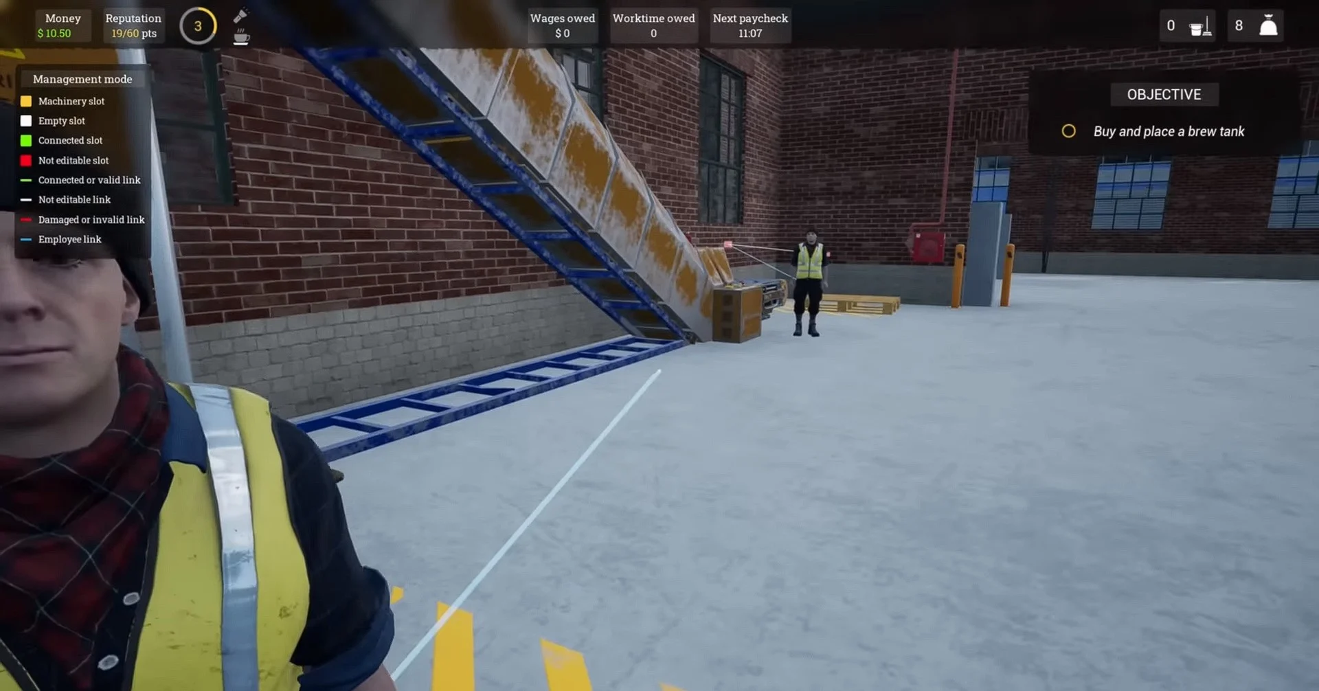 После назначения работника на рабочую станцию нажмите клавишу Tab, чтобы выйти из режима управления. Будьте внимательны и убедитесь, что слоты для поддонов связаны с рабочими станциями, так как персоналу придется получать ресурсы из этих слотов для поддонов для правильной работы.