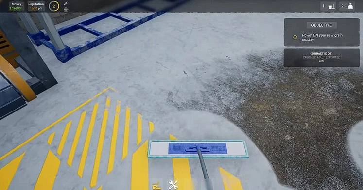 Но что касается уборки грязных пятен вокруг завода, вы получаете 3 очка репутации за каждое убранное грязное пятно, но сначала вам нужно будет приобрести Метлу. Это первый инструмент, который можно купить в магазине инструментов за 20 долларов. Если у вас есть метла, то ее можно использовать, нажав клавишу «1», и начать убирать грязные пятна, удерживая левую кнопку мыши.