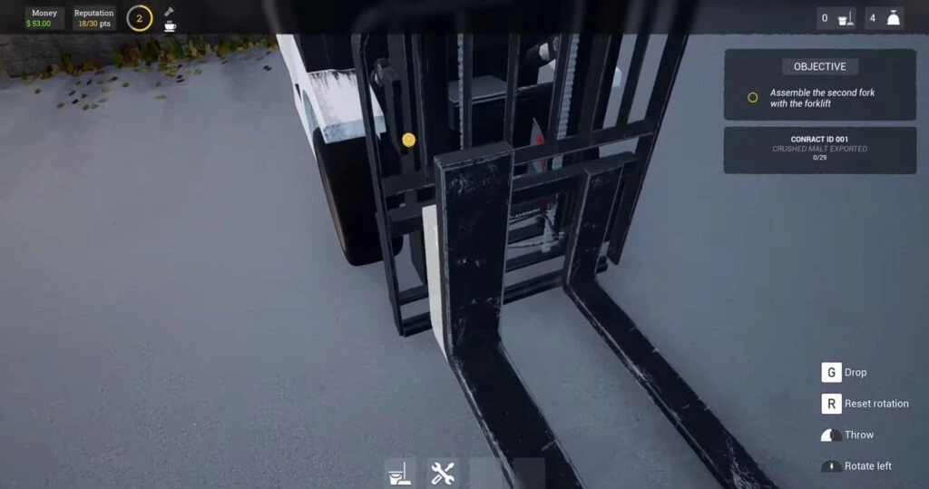 Для начала, вилочный погрузчик становится доступным после достижения игрового уровня репутации. Чтобы повысить уровень репутации, вам нужно будет выносить мусор и прибираться внутри завода, используя метлу. Когда вы достигнете второго уровня репутации, вы сможете приступить к выполнению первого контракта, который потребует переработки зерна с помощью зерновой дробилки.