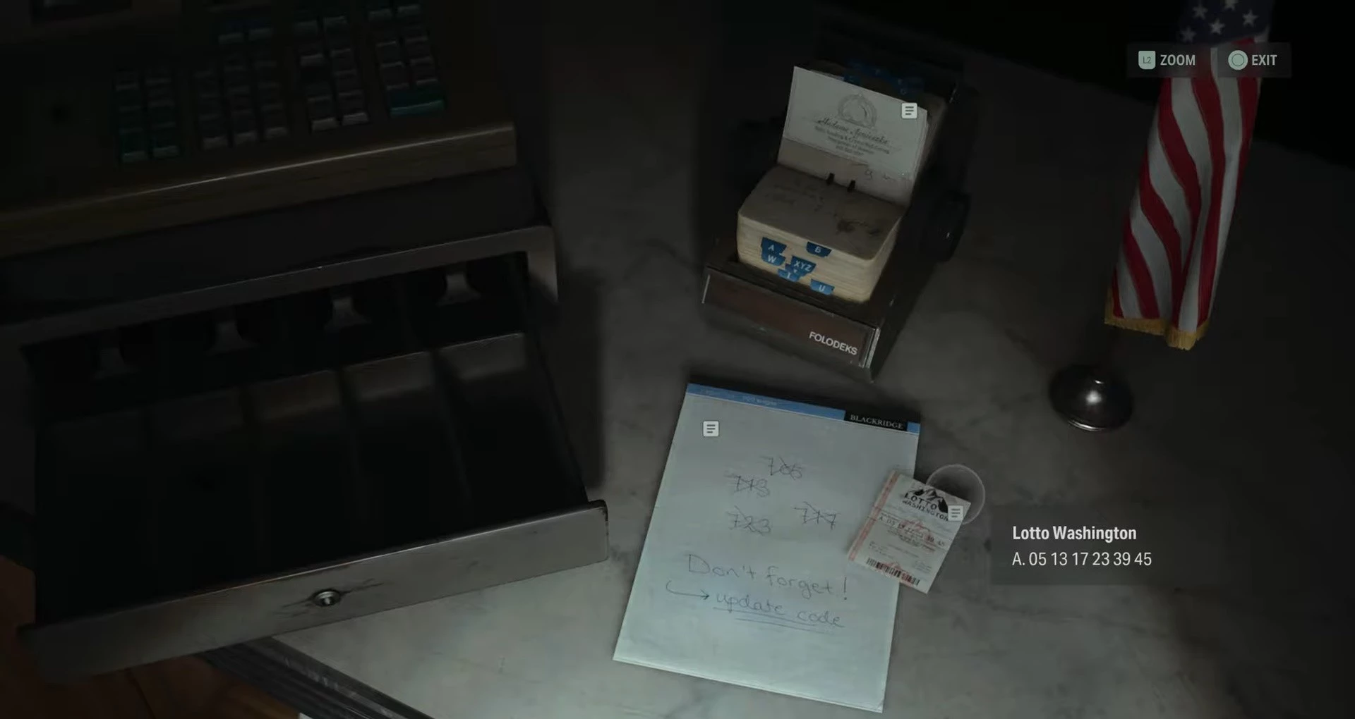 Когда вы подойдете к кассе, вы заметите блокнот со списком различных кодов. Однако не стоит радоваться заранее, так как ни один из них не подходит. Однако, рядом с блокнотом вы найдете билет от «Вашингтонской Лотереи». Цифры кодов, указанные в блокноте, соответствуют цифрам на билете. Подключив логику, вы можете определить следующий набор чисел. Таким образом, полученный код будет «739».