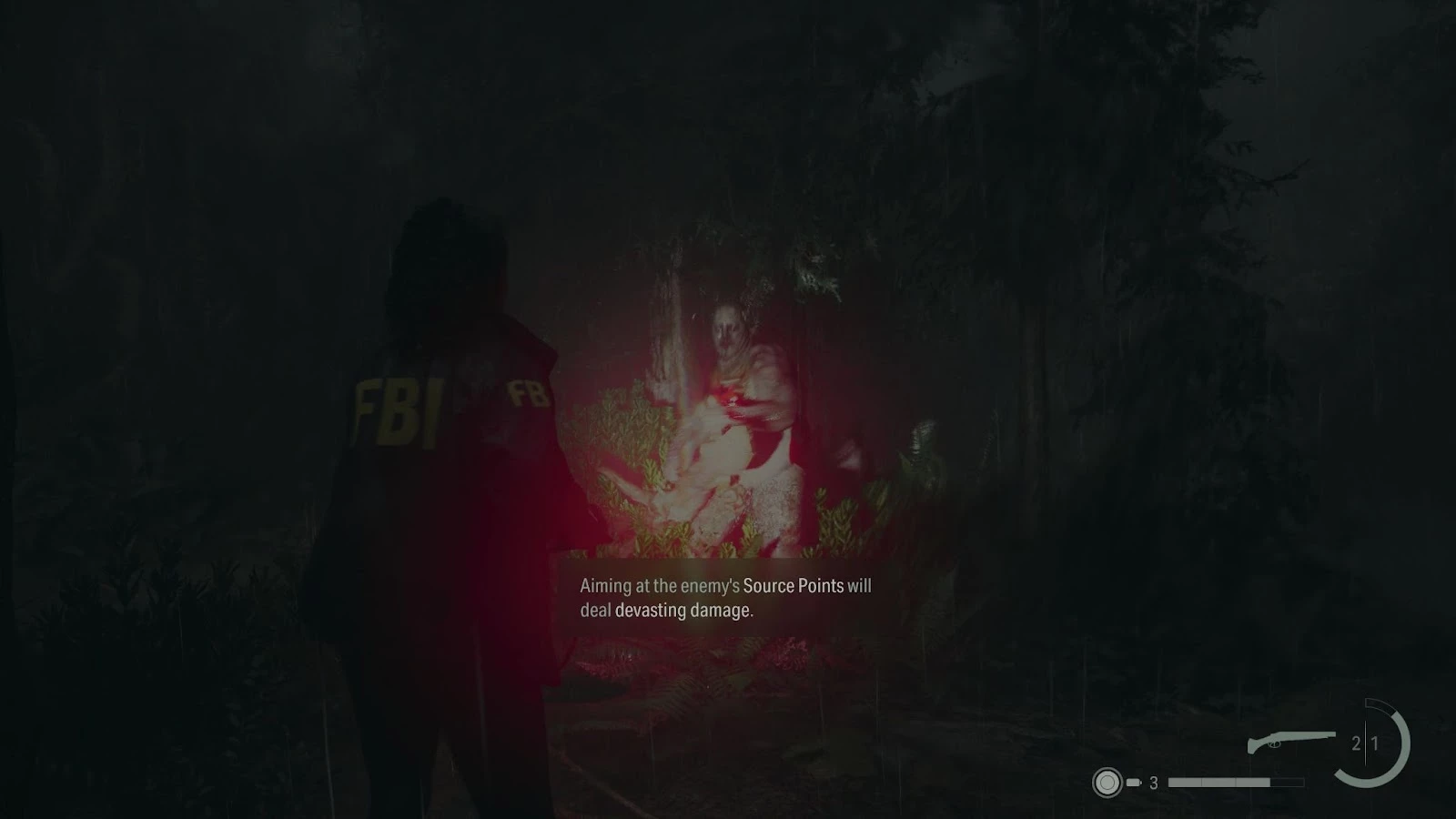 С самого начала сражения возьмите фонарик и разгоните темноту противника. Затем сфокусируйте огонь на красной точке на его груди. Когда она загорится, старайтесь избегать сильных ударов и стрелять в голову. Если вы нанесете ему достаточно урона, мертвец телепортируется на соседний холм и вызовет бурю темноты и ярости. Бегите к ближайшему проходу на поляне.