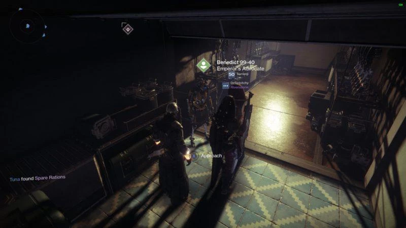 После того, как вы доберетесь до Пристройки в Башне, идите налево от области, а не вверх по лестнице в сторону Дрифтера. Там будет небольшой коридор, освещенный фонарем на стене. Следуйте по этому коридору в комнату, где находится Бенедикт 99-40, Адвокат Императора. Разговор с ним откроет квест при первом контакте, а также некоторые части брони для покупки. Бенедикт 99-40 будет основным контактом в сезоне изобилия, предлагая все, что Калус может предложить.