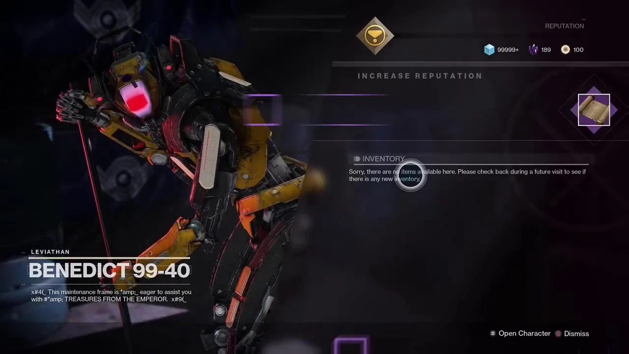 Бенедикт 99-40 похож на всех других торговцев в башне, за исключением того, что он тайный агент Императора Калуса. Жетоны Калуса, которые даются за завершение событий в рейде, могут быть переданы Бенедикту в обмен на специфичные для Левиафана энграммы рейда и снаряжение. Эти энграммы будут содержать либо рейдовое оружие, либо броню с возможностью включения шейдеров. Хотя рейд Левиафана может быть устаревшим и предлагать недостаточно хорошее снаряжение, его все же стоит завершить, чтобы вы могли получить доступ к сундукам.