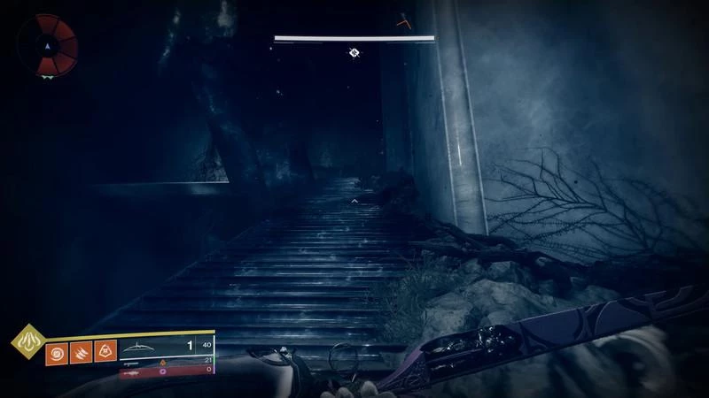 Вам надо найти большой дверной проем. Пройдите через него, и вы получите дебафф замедление, что означает, что вы не можете совершить двойной прыжок. Перемещайтесь по области как можно быстрее, и убивайте всех врагов. Прыгните через поле на другой стороне и пересеките пропасть впереди.