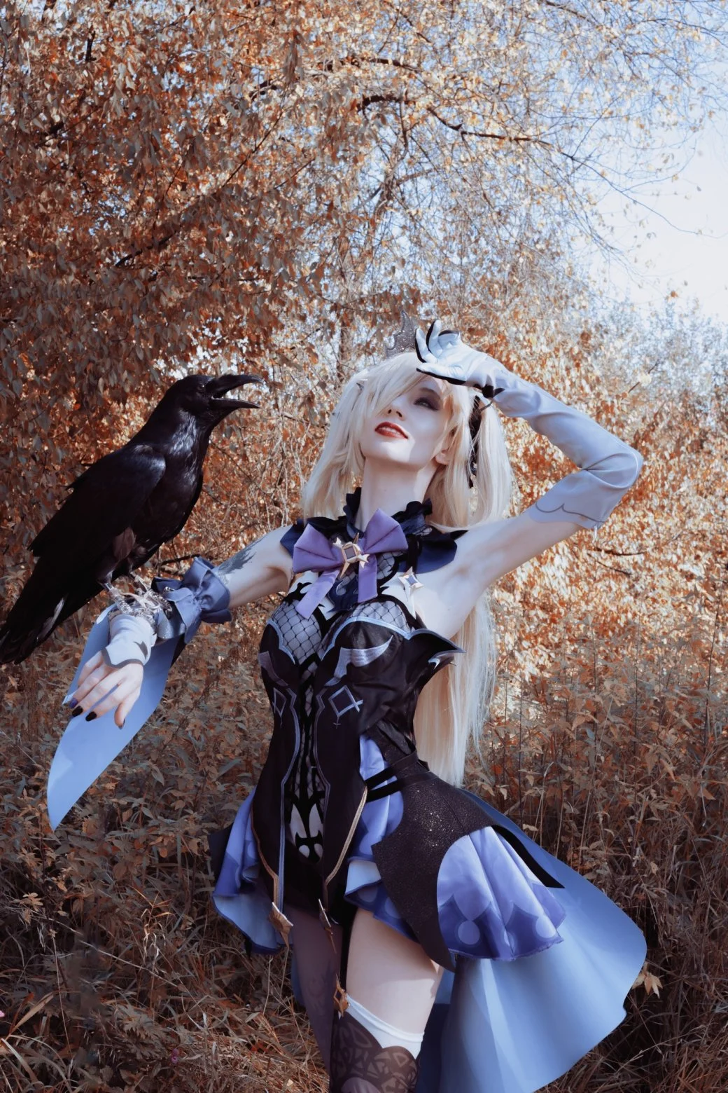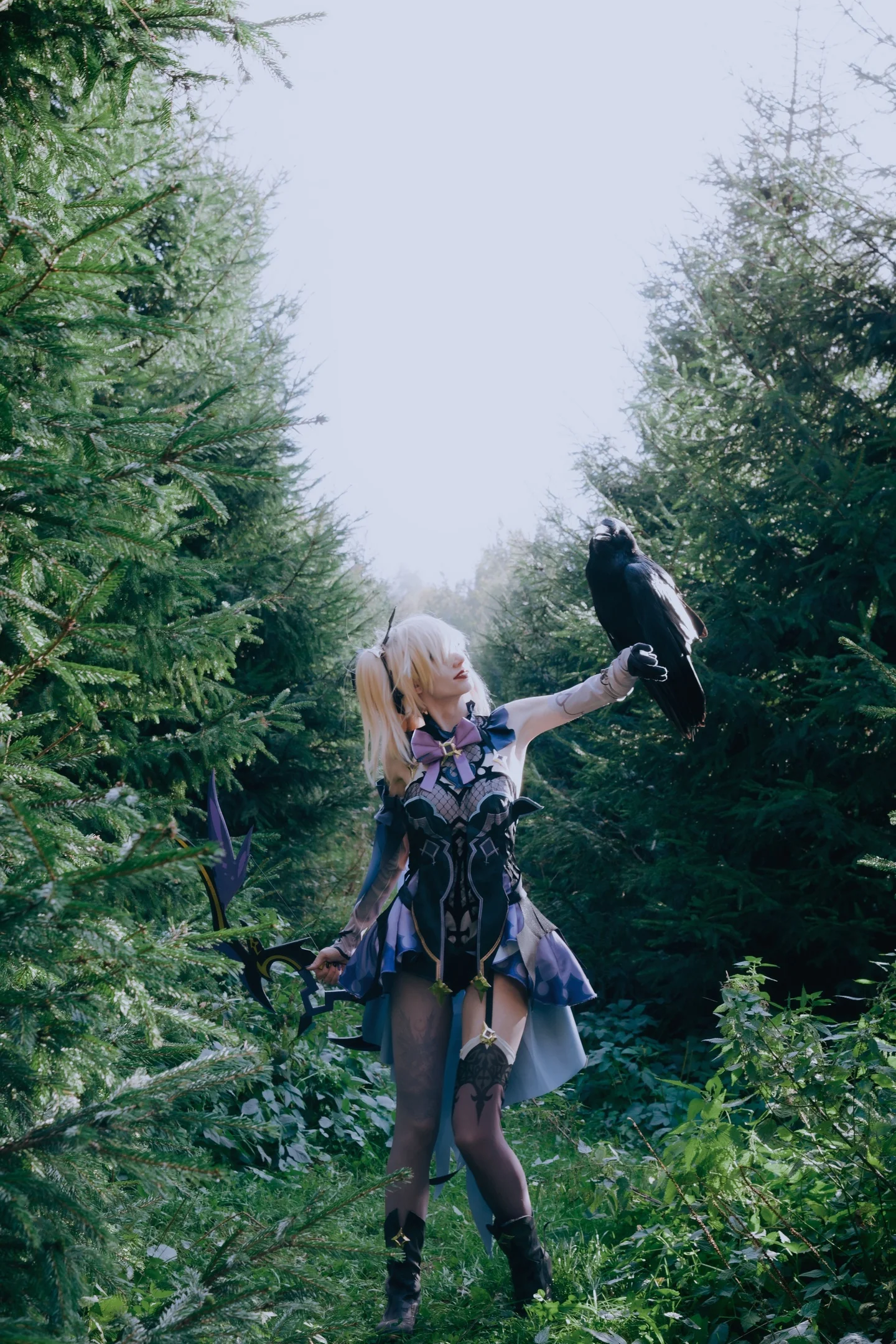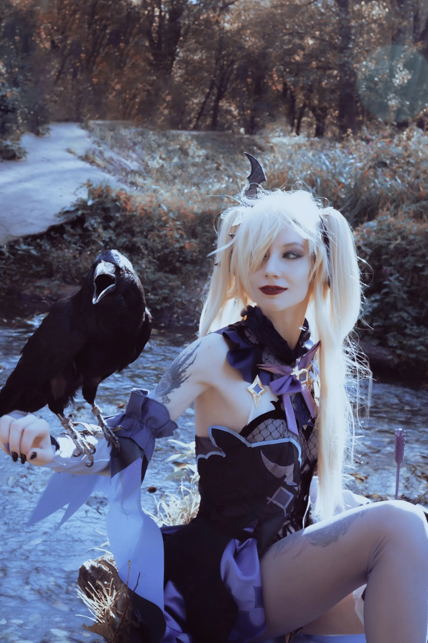 Эта уникальная героиня, обладающая стихией Электро, способна вызвать ворона ночи под именем Оз, который атакует врагов молниями. Так что для создания аутентичного косплея понадобился настоящий ворон.