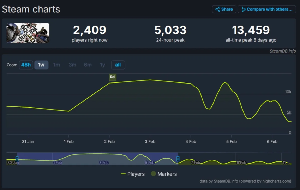 Интерес к онлайн-игре Suicide Squad: Kill The Justice League на платформе Steam продолжает снижаться. Если при ее полноценном релизе 2 февраля количество игроков превышало 13 тысяч человек, то в последние 24 часа на пике игровых действий насчитывалось всего лишь немного больше 5 тысяч игроков.