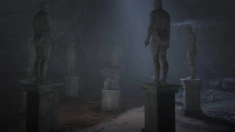 В этой комнате есть семь статуй, а ваша задача — подсчитать количество пальцев на каждой из них. Первоначально кажется, что правильный ответ — 2, 4, 5, 8, 3, 4, 6. Однако у одной из статуй с четырьмя пальцами отсутствует рука, которая валяется на полу в пещере. На ней изображены три пальца.