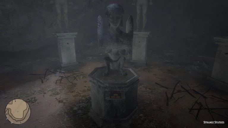 Там вы должны обнаружить щель в скале. Подойдите в статуе химеры и изучите ее. Артур изучит статую, выполнит небольшую зарисовку в своем журнале и назовет всю эту сцену «Странными статуями». Что же, статуи действительно странные.