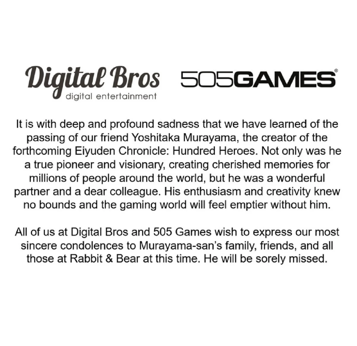 Стало известно, что 6 февраля скончался создатель японской ролевой серии Suikoden Ёситака Мураяма. Увы, он не дожил до релиза своей последней игры Eiyuden Chronicle: Hundred Heroes, запланированного на 23 апреля. В этом проекте Мураяма занимал руководящую позицию, и, несмотря на трагическую кончину, его коллеги издатель и команда разработчиков решили высказаться по поводу этого горького прощания.