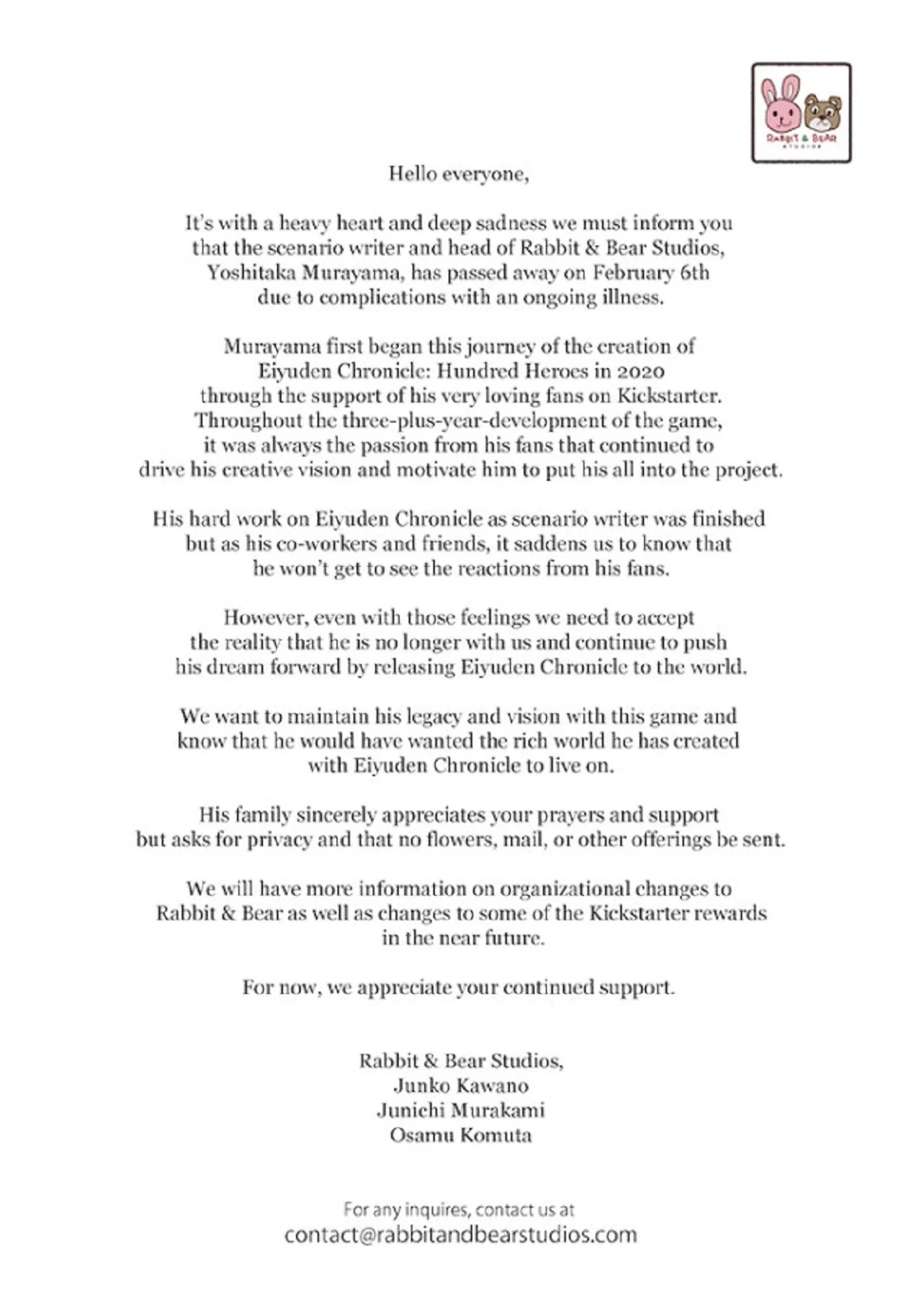 Студия Rabbit & Bear поделилась информацией о причине смерти Ёситаки – осложнения, связанные с продолжительным заболеванием. Болезнь не остановила Мураяму в создании игр, так как он чувствовал страсть и поддержку поклонников, которые помогли собрать средства для его последнего проекта, Eiyuden Chronicle: Hundred Heroes, на платформе Kickstarter. Даже несмотря на все трудности, сам геймдизайнер успел завершить сценарий, но, к сожалению, не сможет увидеть окончательный результат своего труда.