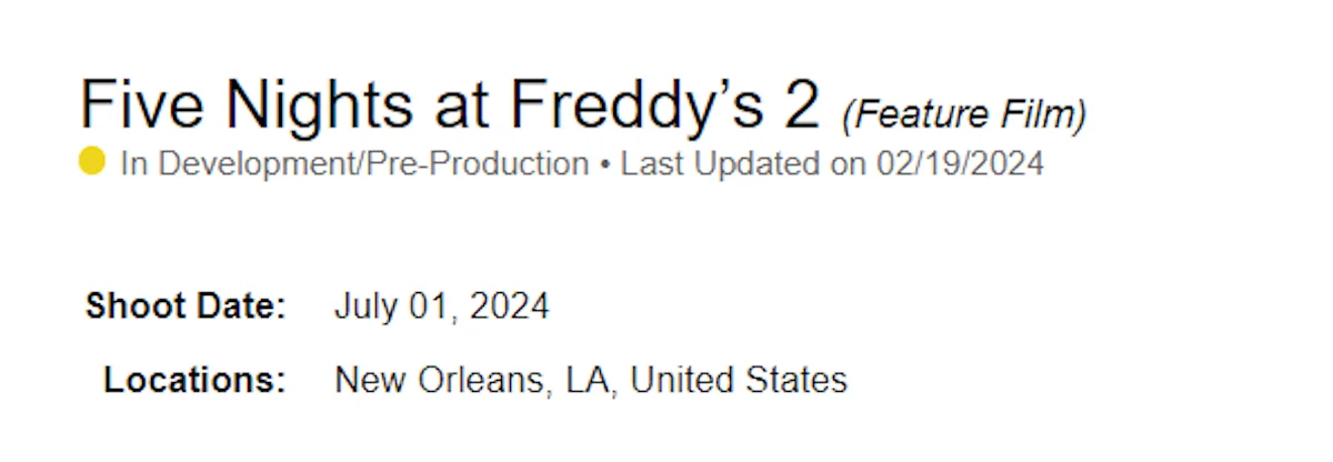Съемочные работы над фильмом "Five Nights at Freddy's 2" начнутся 1 июля в Новом Орлеане, это подтверждают данные Film & Television Industry Alliance. Эмма Тамми, режиссер первой части, возглавит проект, а Джейсон Блум вновь будет продюсером. В прошлом месяце актер Джош Хатчерсон подтвердил, что съемки сиквела начнутся в этом году. Пока нет информации о дате выхода второй части.