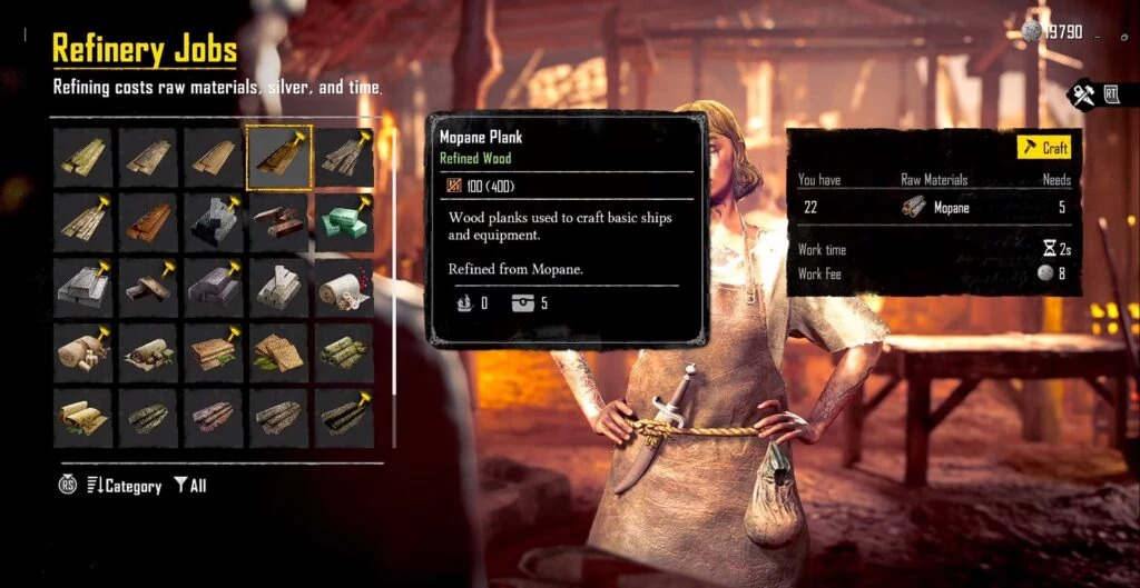 После создания инструмента "Пила" отправляйтесь в район побережья Африки на карте и обнаружьте деревья мопане. Пройдите к местам их расположения и начните собирать мопане. Соберите как можно больше за один период времени, а затем отправляйтесь на нефтеперерабатывающий завод, где вы сможете использовать их для создания досок. Переработка каждой доски потребует 5 единиц мопане и 8 серебра, и процесс займет две секунды.