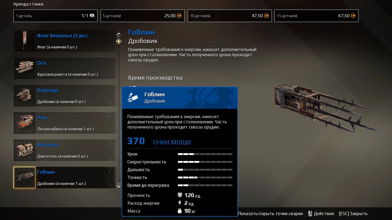 Особенности дробовика позволяют собрать недорогой, но эффективный и нагибучий крафт. Главное преимущество «Гоблина» – малый расход энергии (потребляет всего 2 единицы). Главный недостаток – то, что это оружие с ограниченным углом атаки. Впрочем, при правильной компоновке деталей и это может стать преимуществом. По сравнению с другими дробовиками синего качества – «Кувалдой» и «Самопалом», урон у «Гоблина» меньше, но зато выше скорострельность и дальность стрельбы.