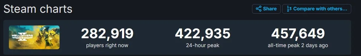 Ответственность за серверы Helldivers 2 несут специалисты Arrowhead и инженеры Sony. Игра достигла пика онлайн-популярности на платформе Steam, где в нее играли около 458 тысяч игроков. Пилестедт также советует игрокам временно отказаться от покупки Helldivers 2, если у них возникли финансовые трудности.